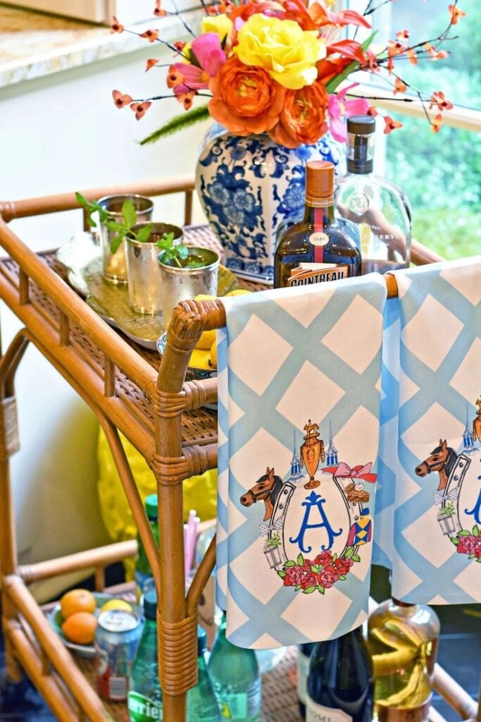 A beautifully styled bar cart is another must-have. You can decorate it with fresh mint, polished glasses, and striped paper straws.