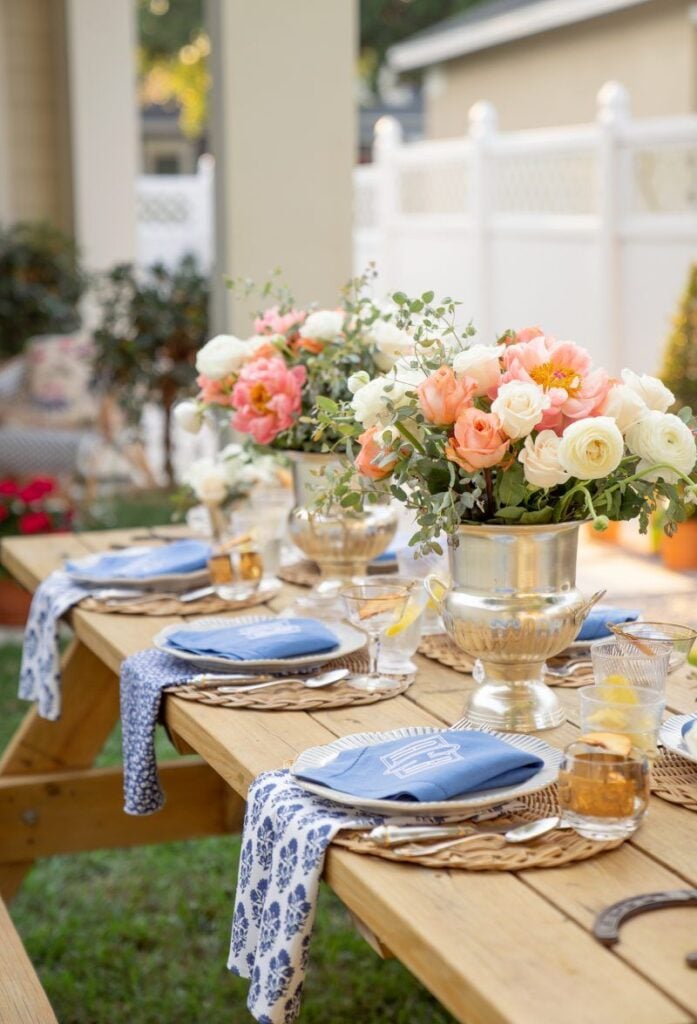 Silver mint julep cups double as gorgeous floral vases, while gingham tablecloths or burlap runners add a touch of rustic elegance to your dining areas.