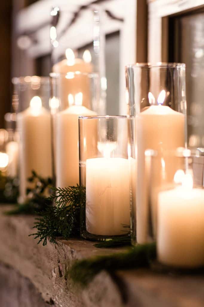 Pine branches, eucalyptus, and holly create stunning backdrops that photograph beautifully, while fairy lights and candles provide that romantic glow every couple wants.