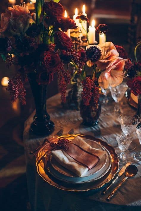 These arrangements combine rich, moody colors with luxurious textures to create an atmosphere of romantic elegance that’s absolutely captivating.